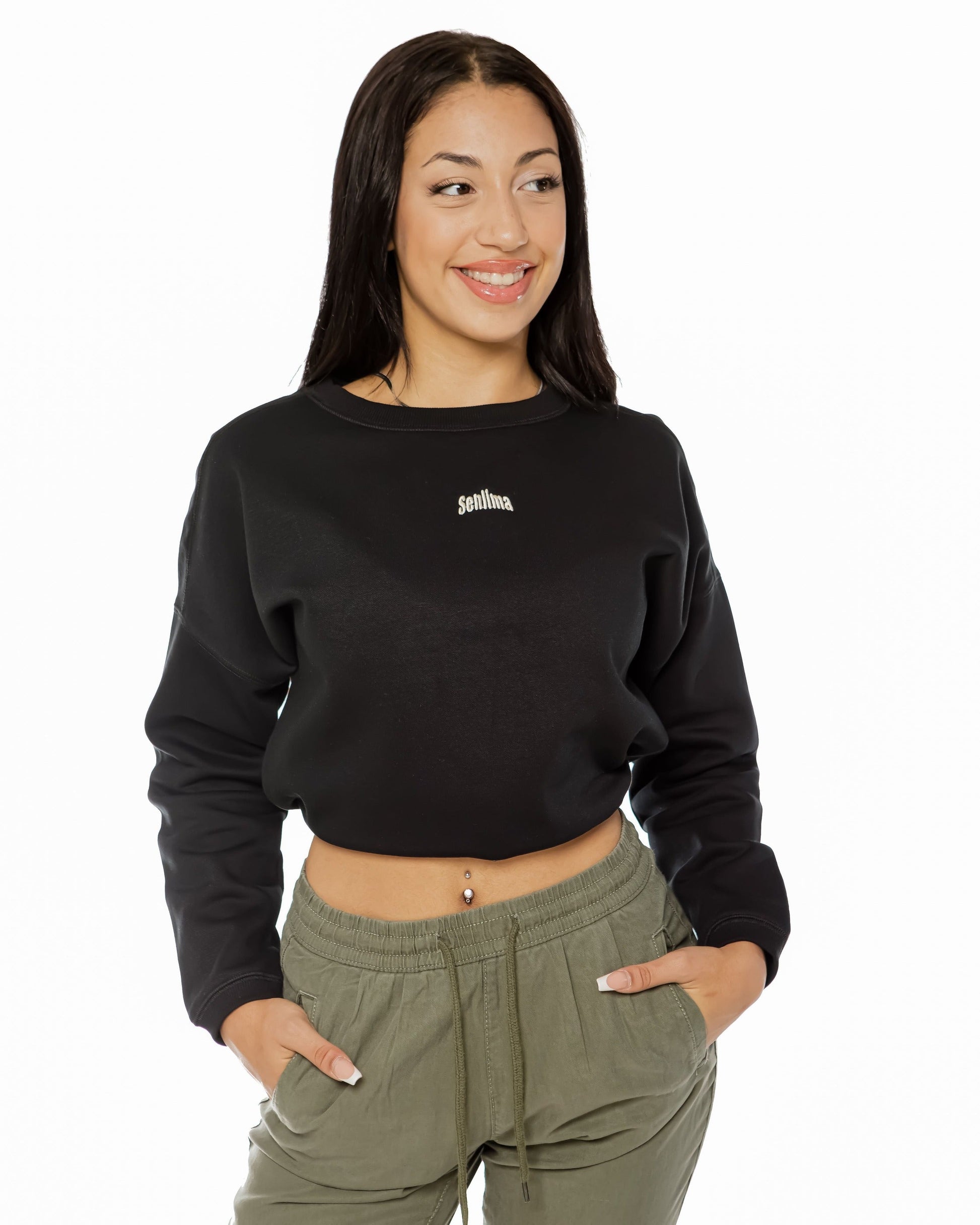 Sudadera de cuello redondo con corte oversize y hombros caídos, en color negro.