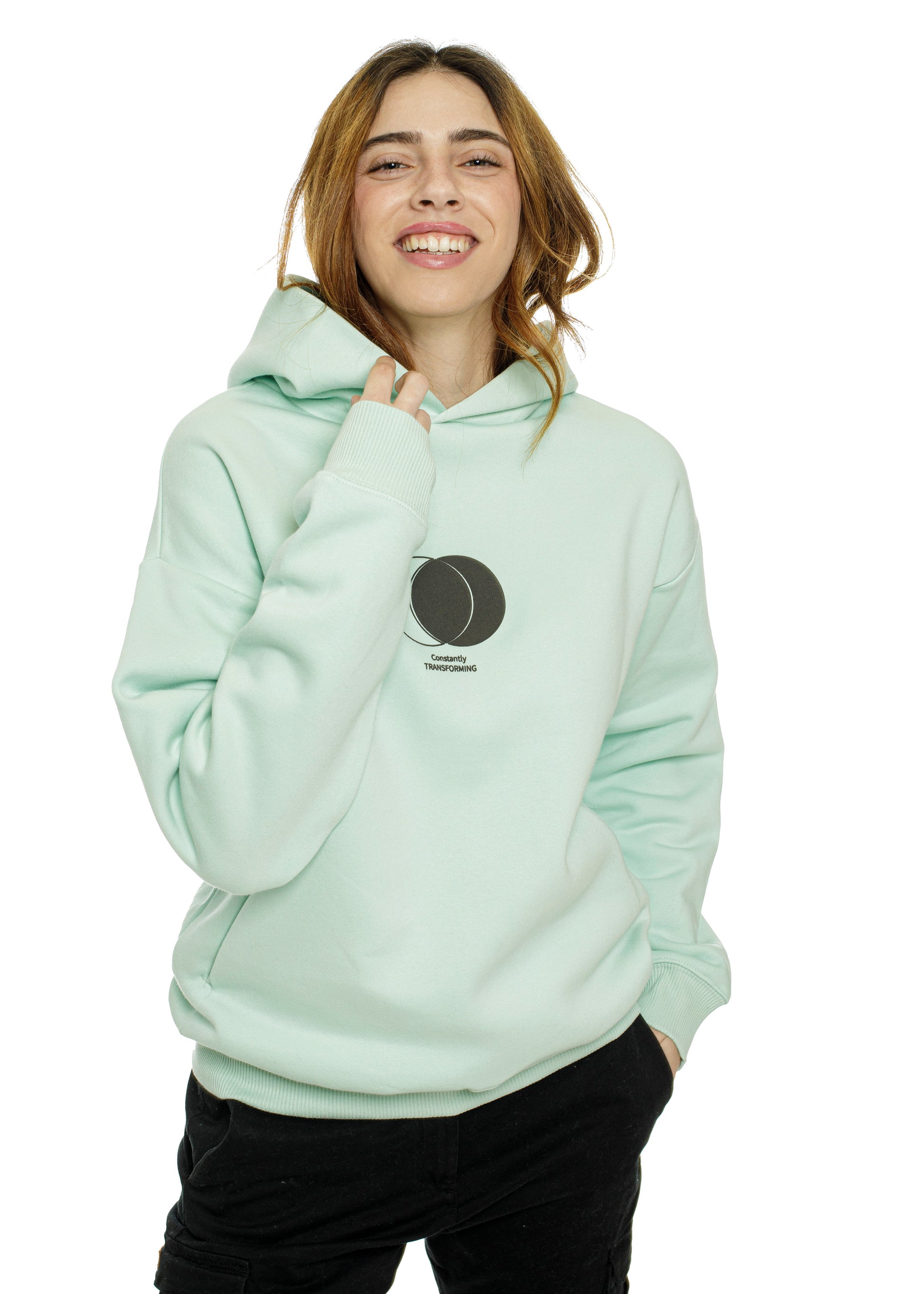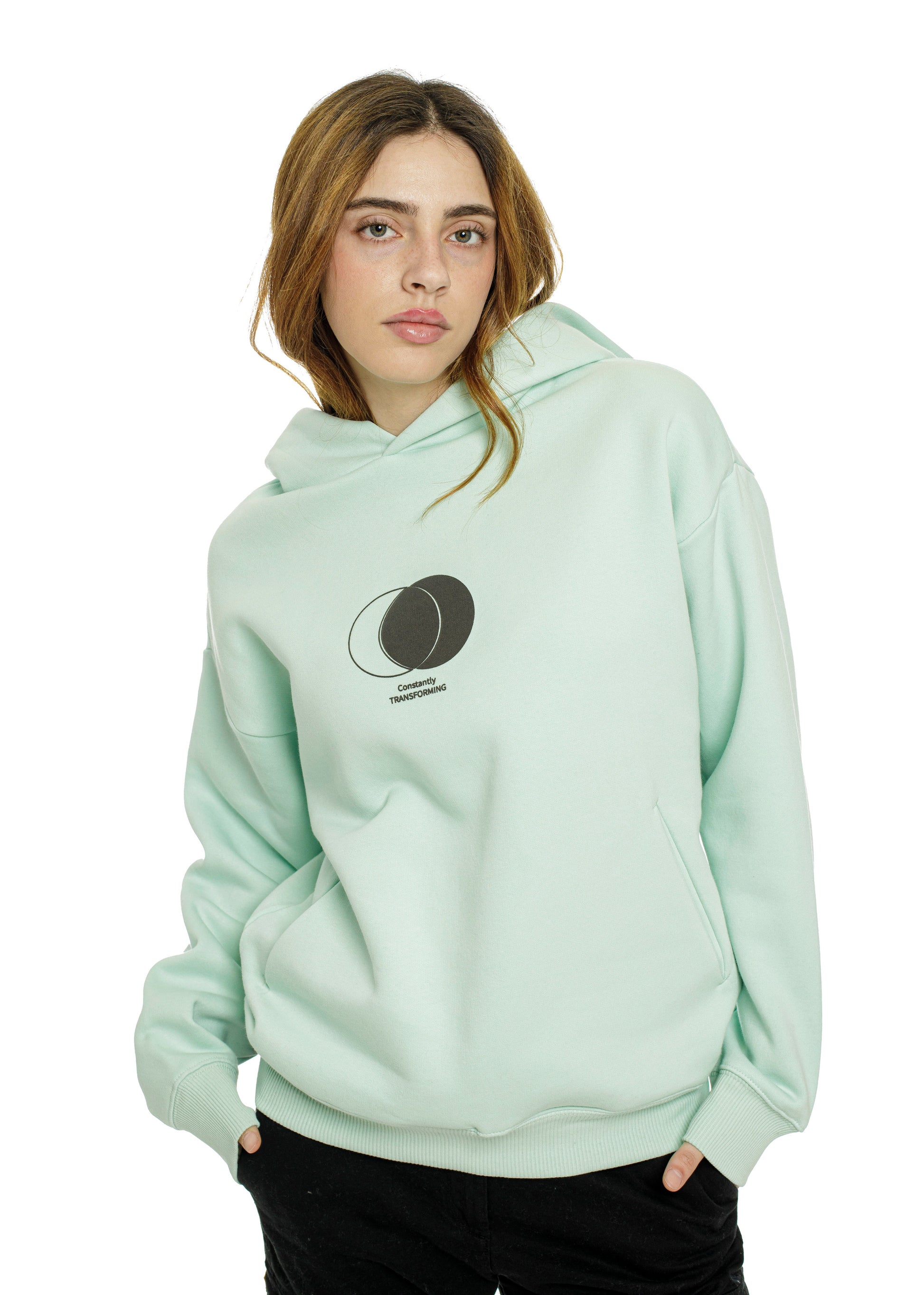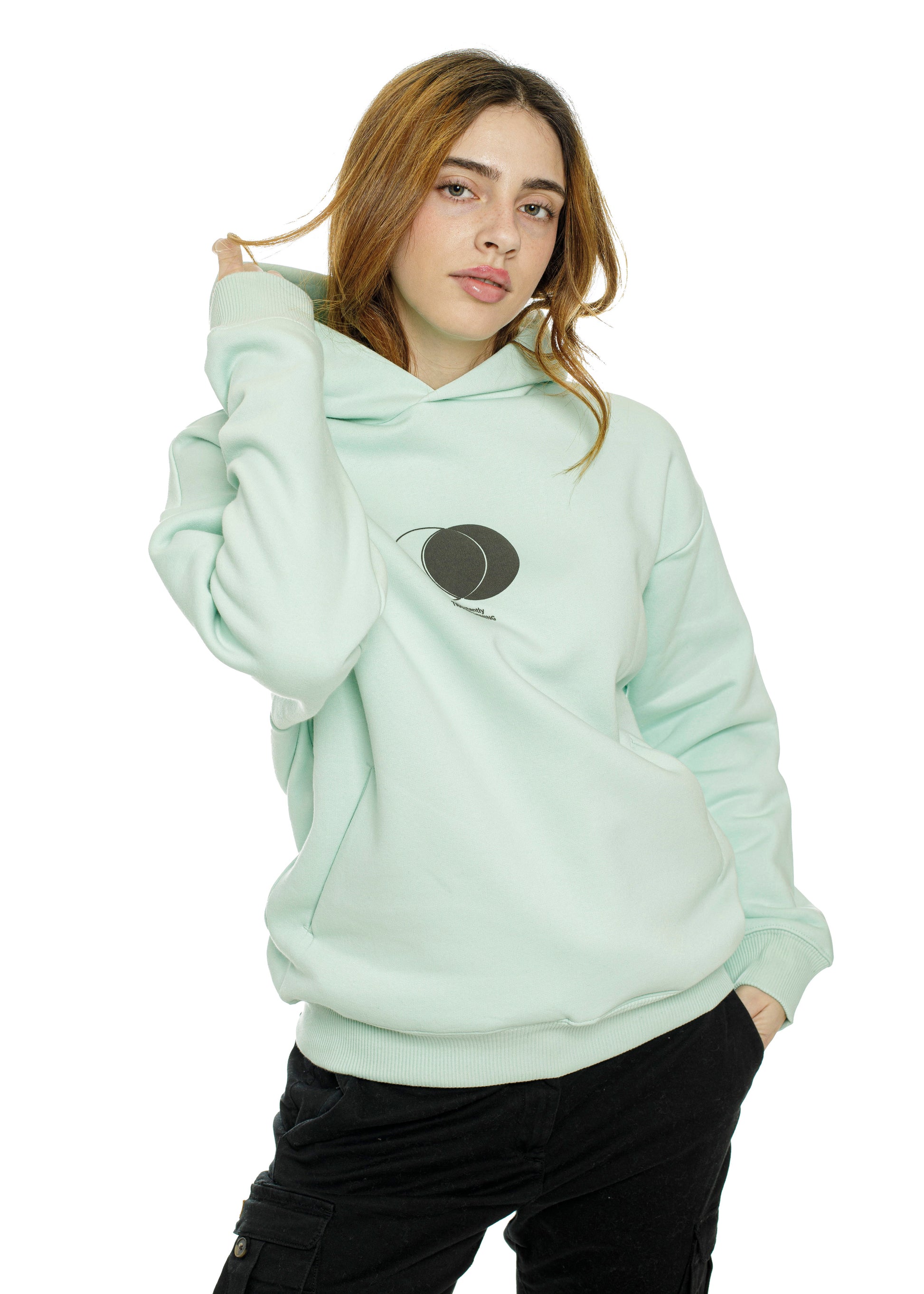 Sudadera verde menta con corte oversize, capucha amplia y tacto muy suave.