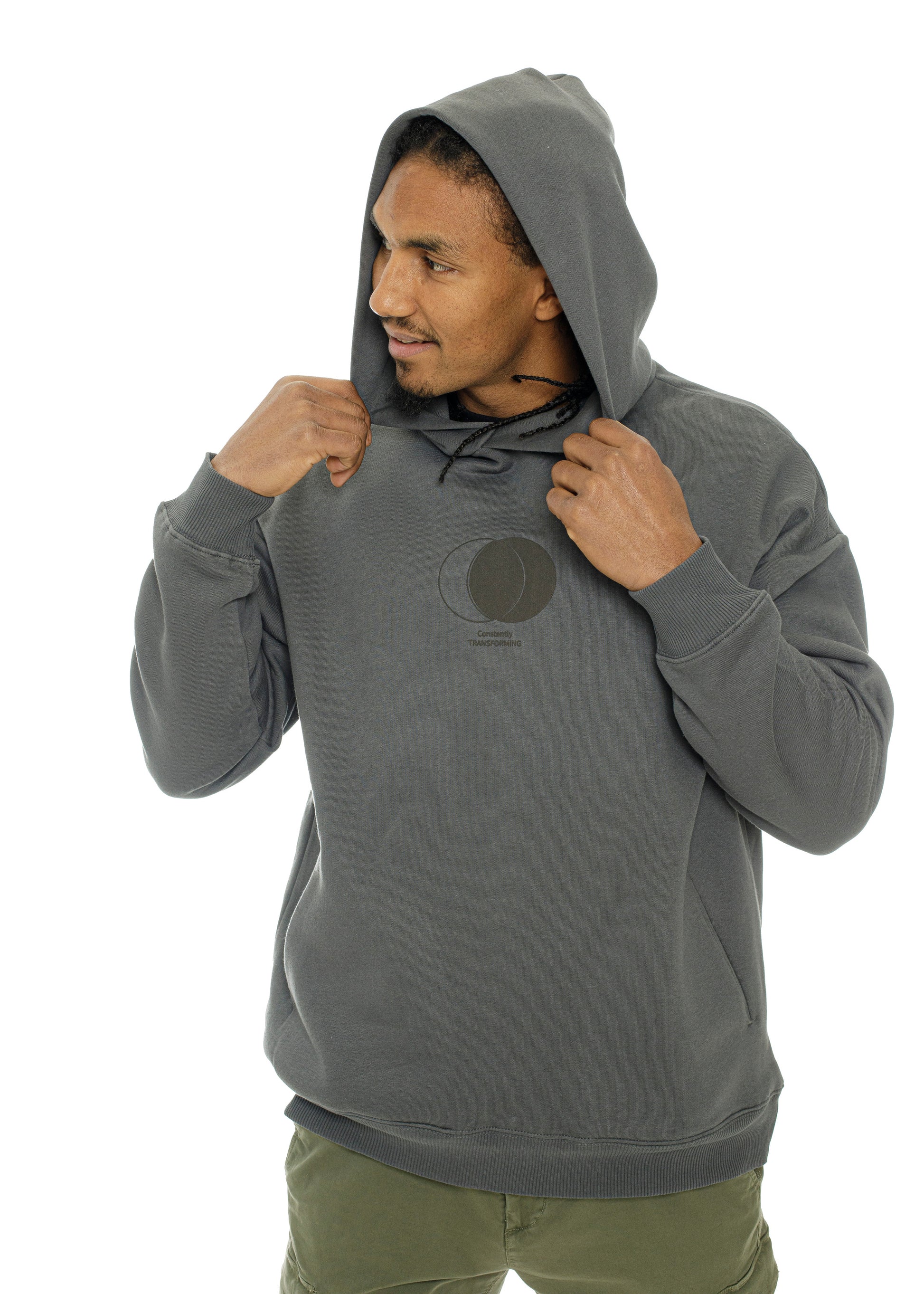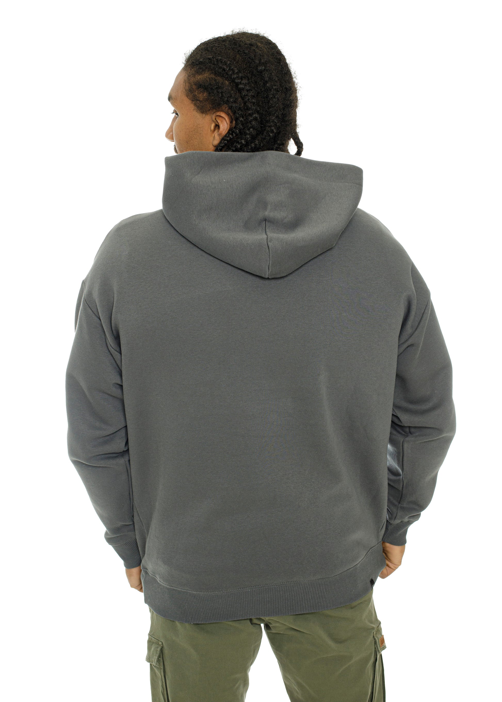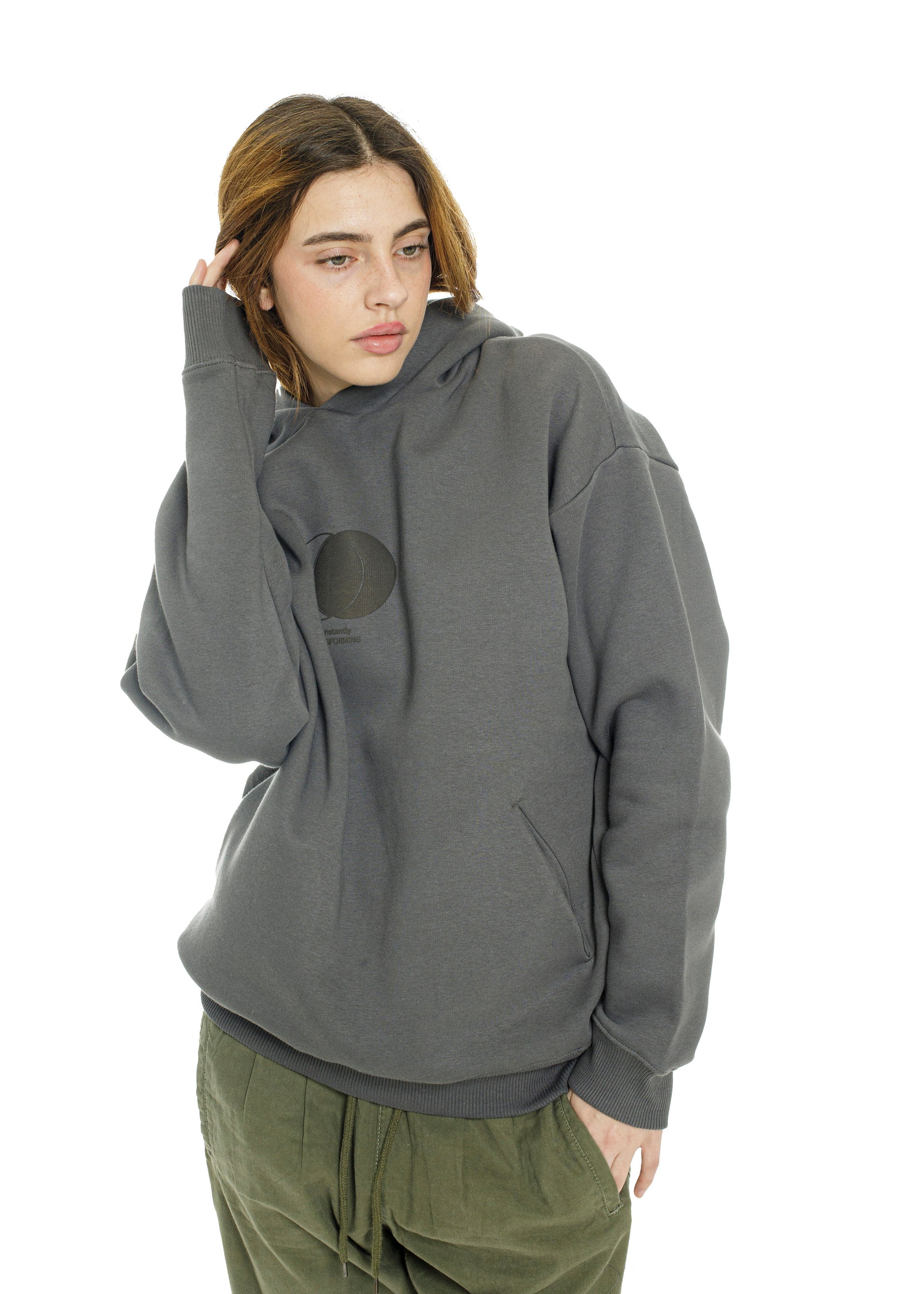 Sudadera gris oscuro con corte oversize, capucha amplia y tacto muy suave.