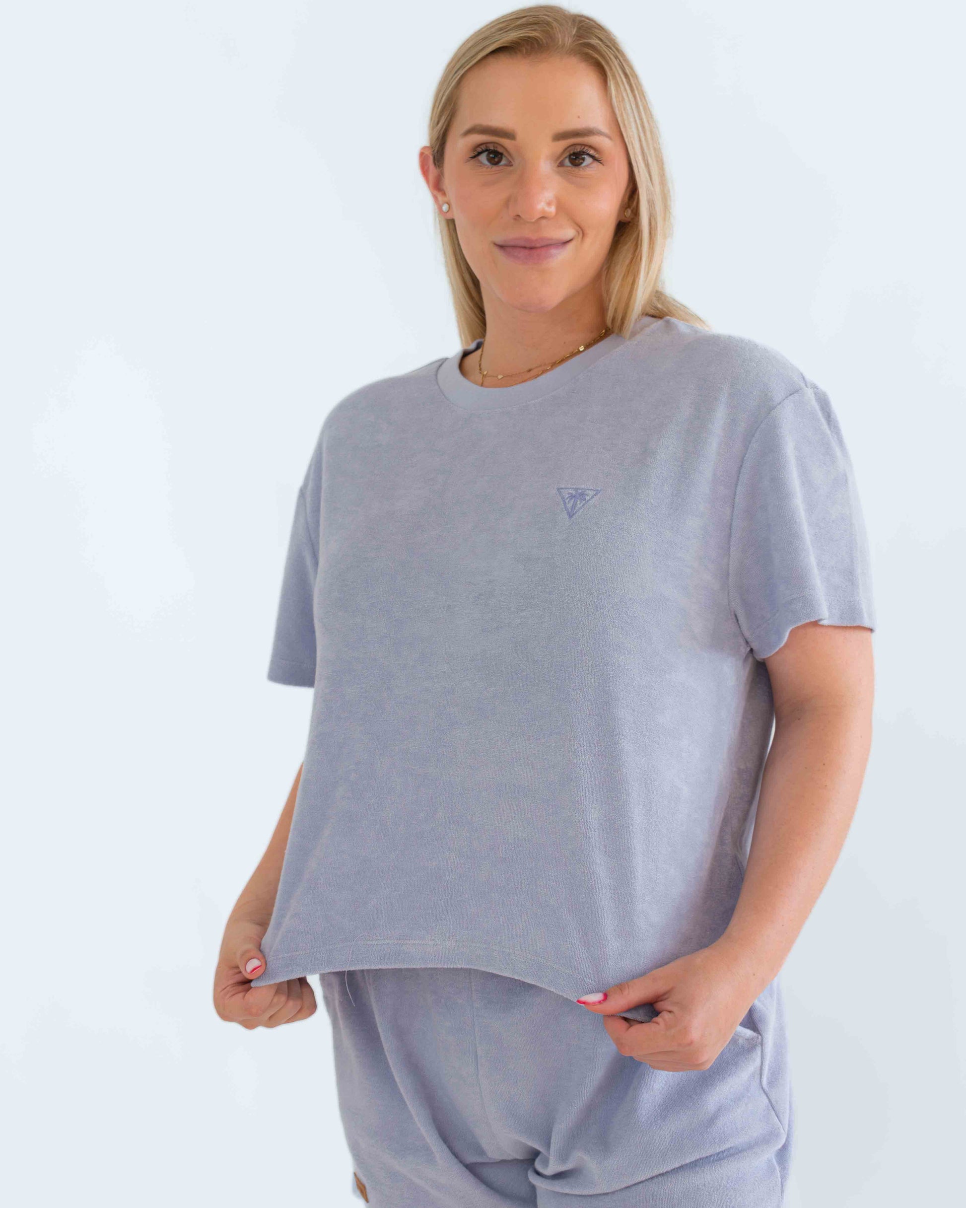 Camiseta de corte oversize y pantalón corto con cintura elástica para mujer, con bolsillos laterales y tejido de toalla, en color lavanda.