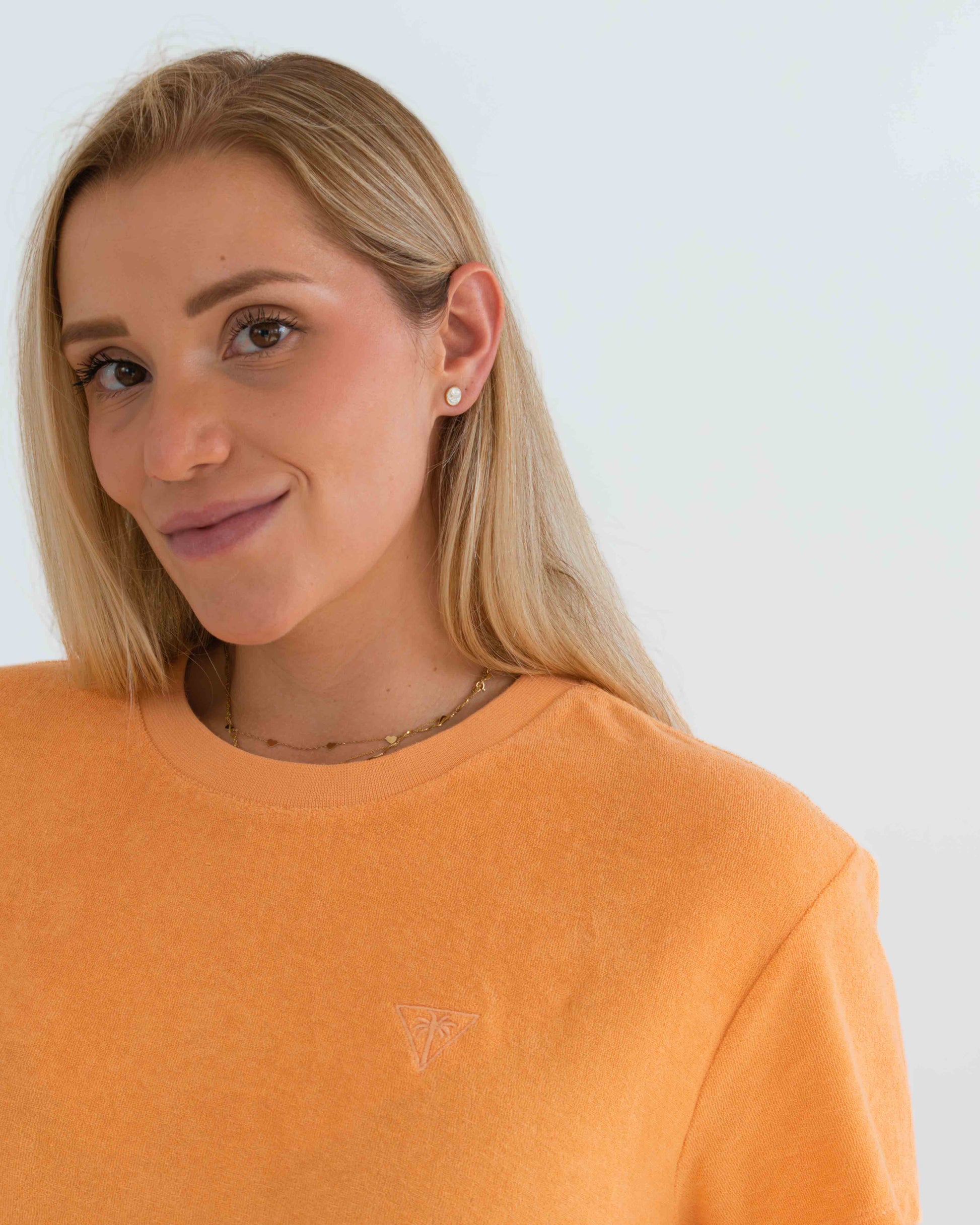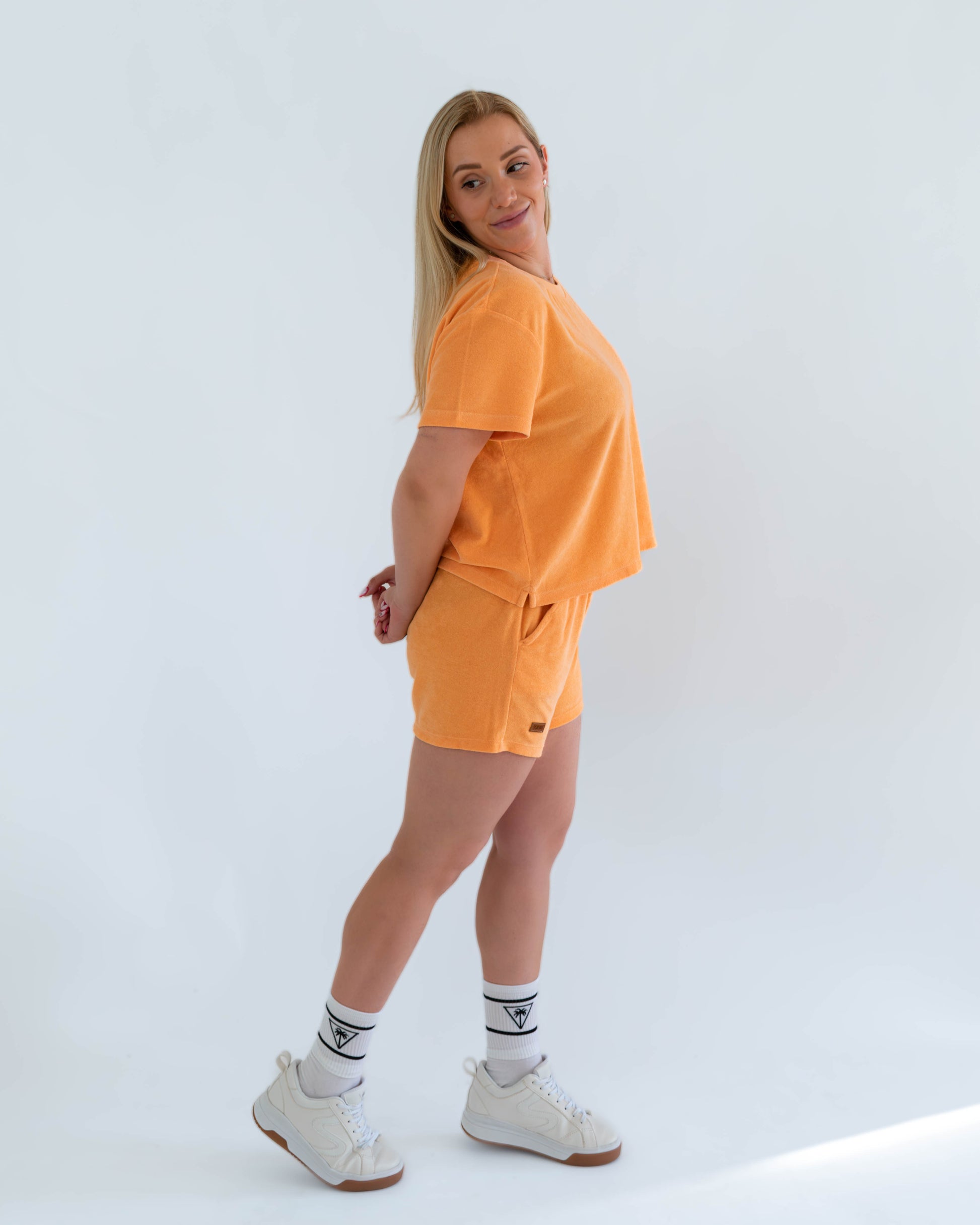 Camiseta de corte oversize y pantalón corto con cintura elástica para mujer, con bolsillos laterales y tejido de toalla, en color naranja.
