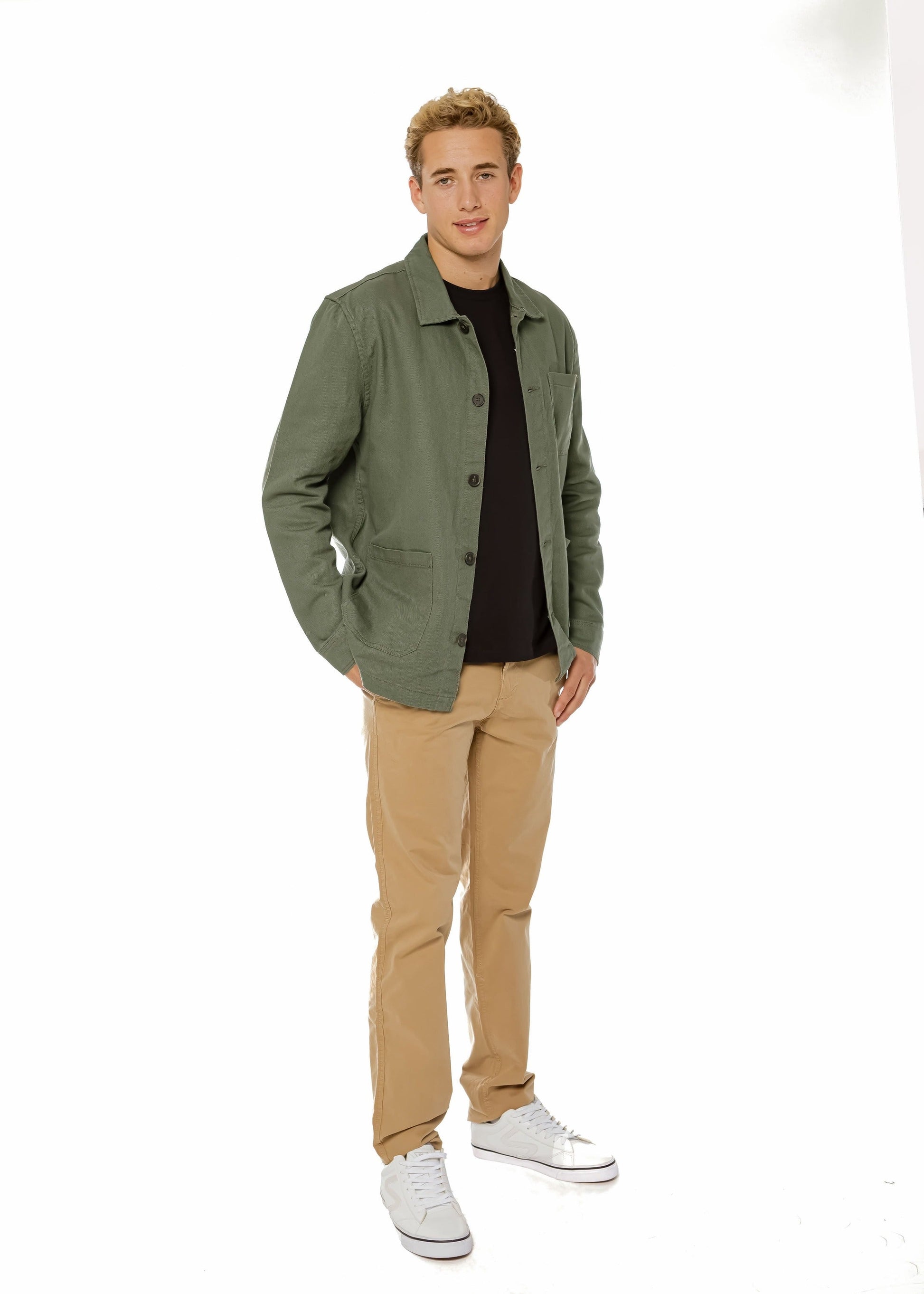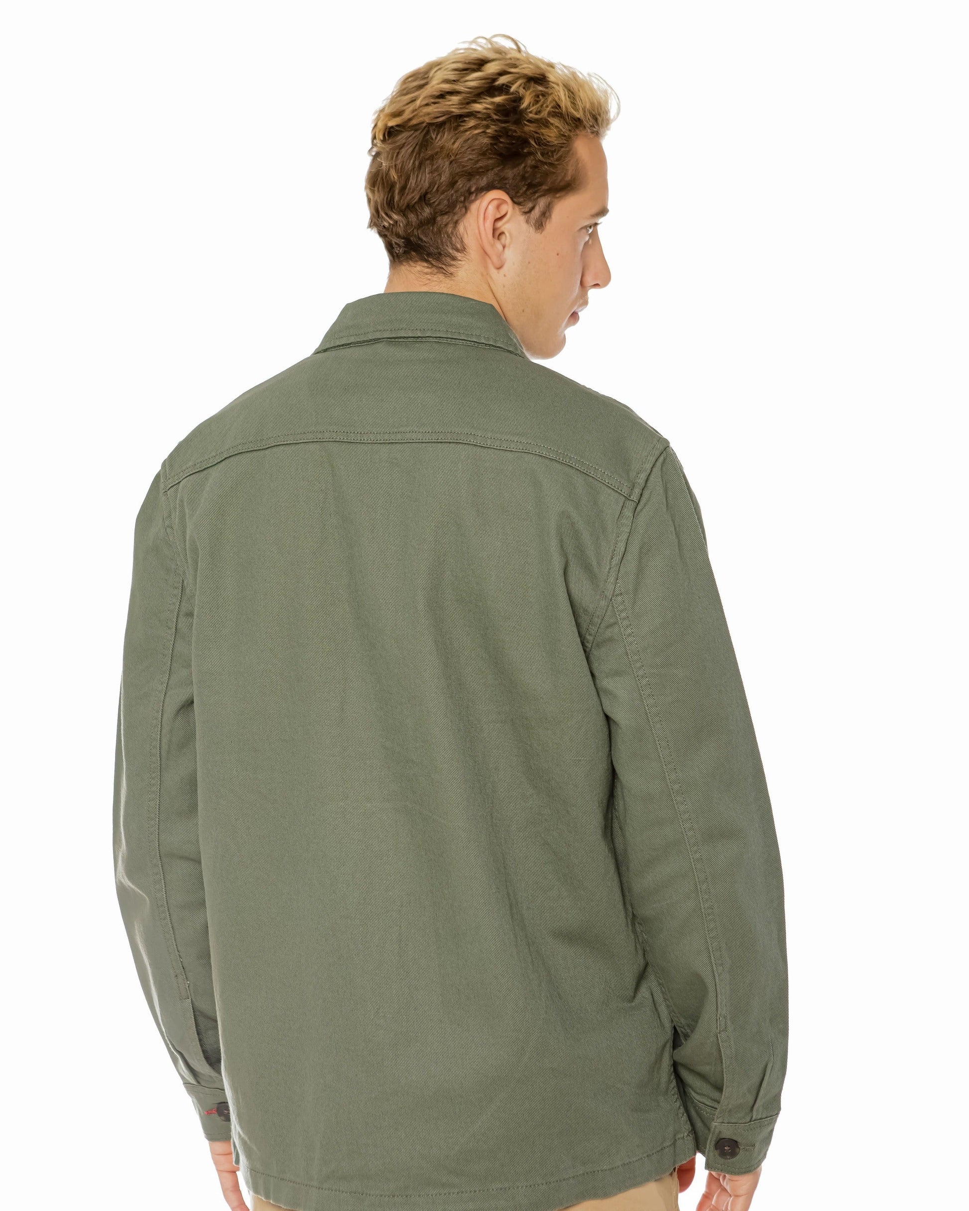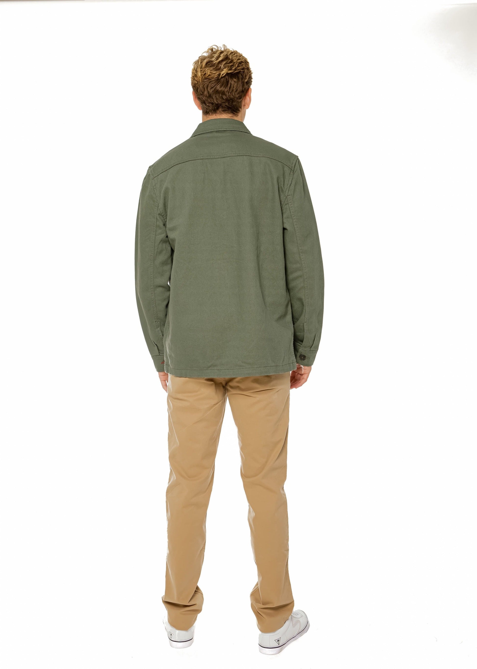 Sobrecamisa de corte regular con efecto lavado, cuero reciclado, botones de plástico reciclado y botonera de puño izquierdo en rojo. Color khaki.