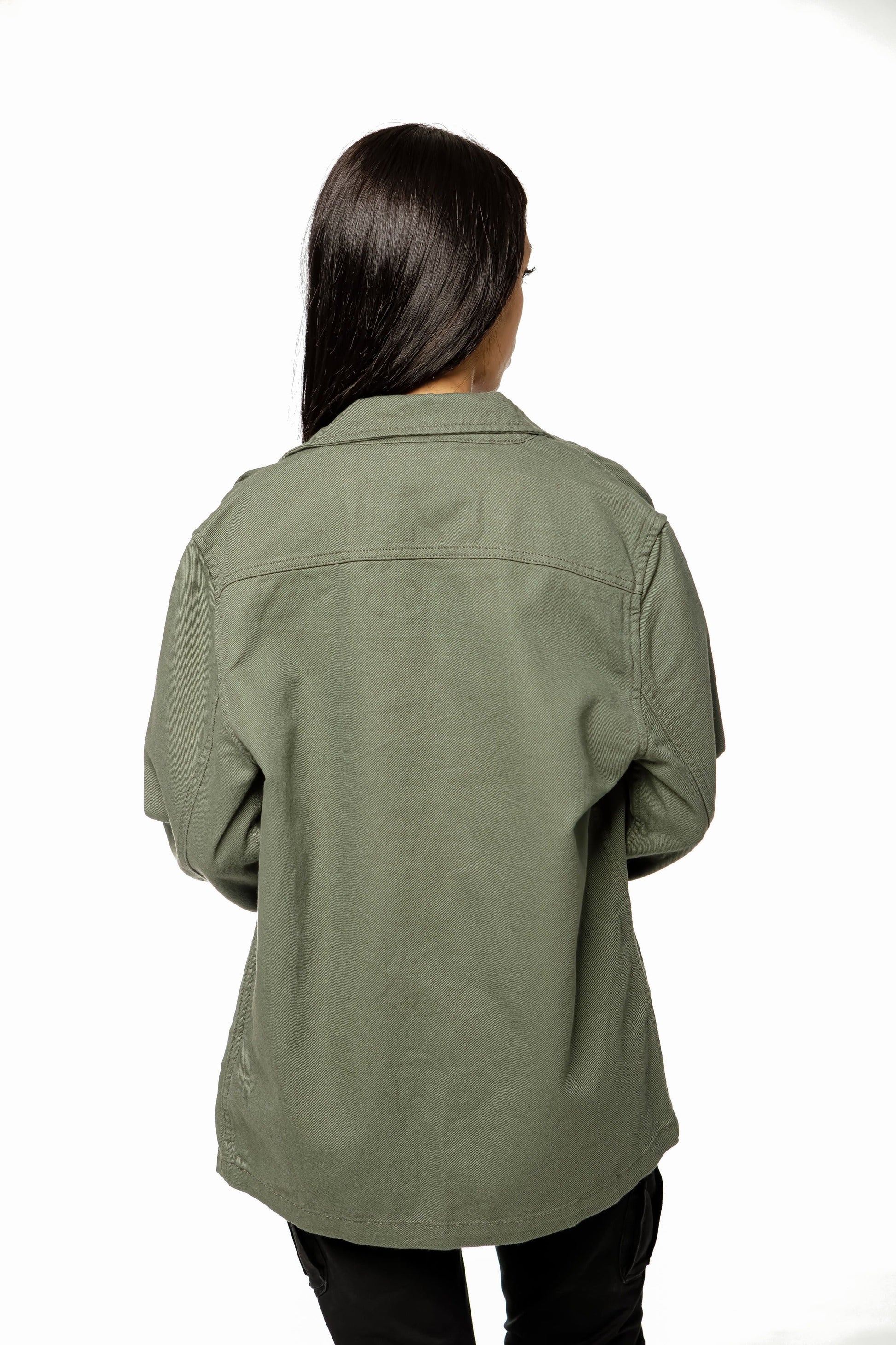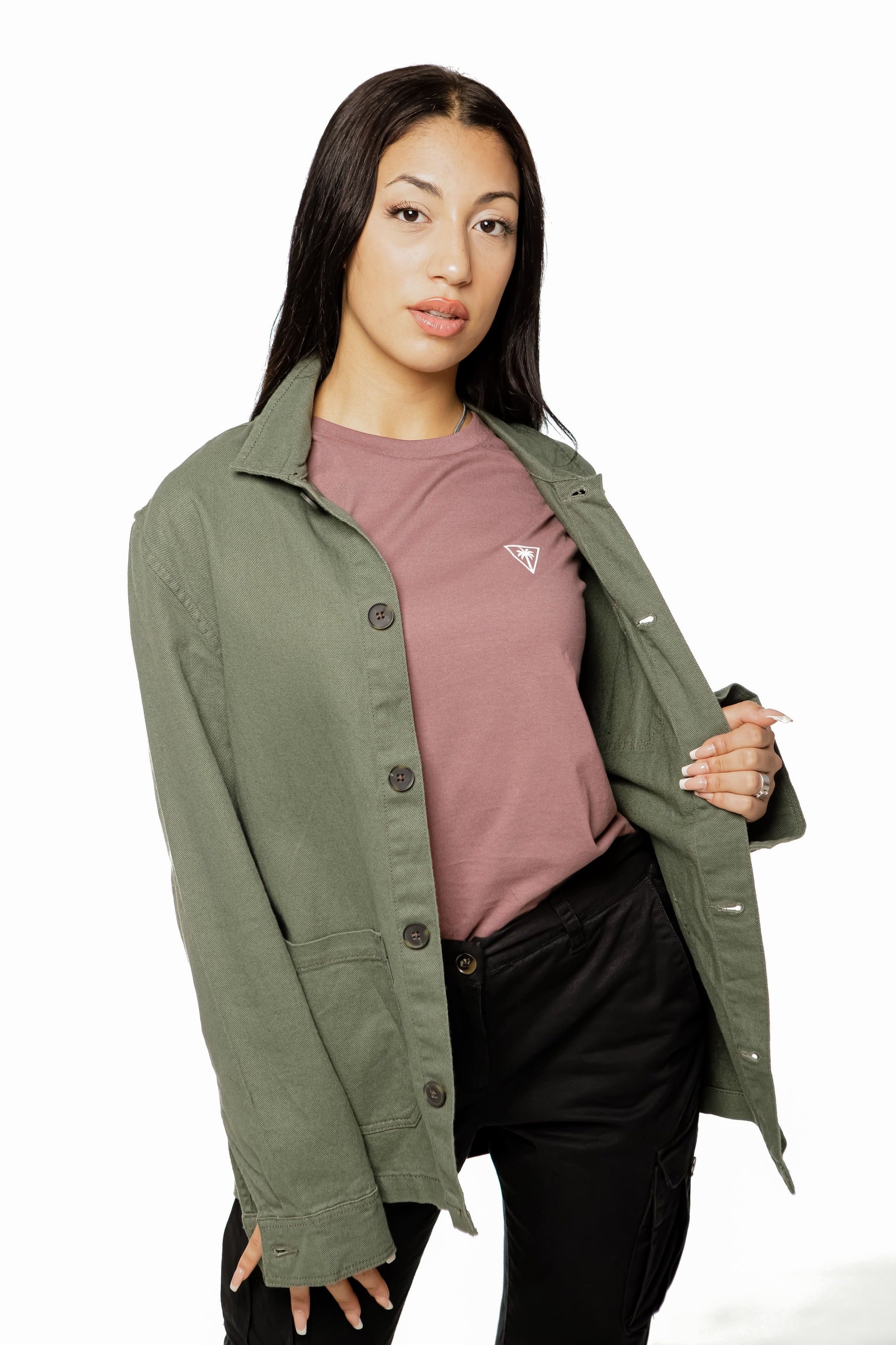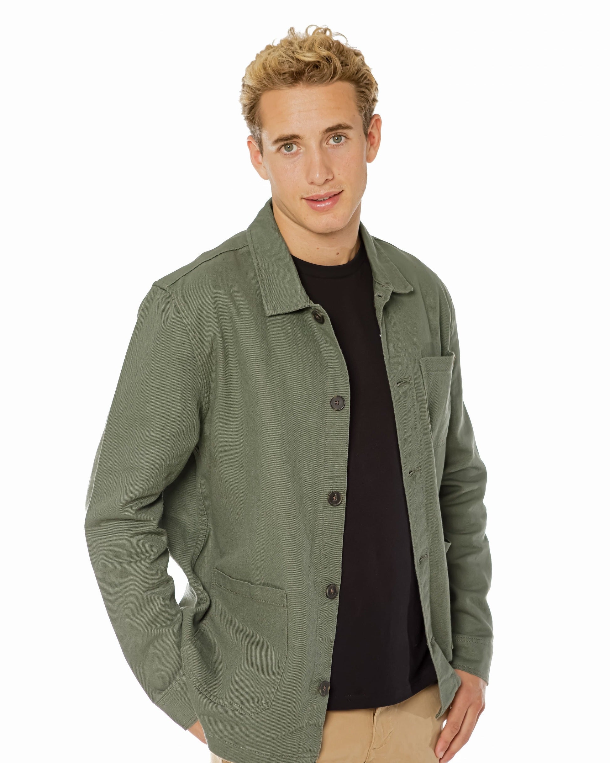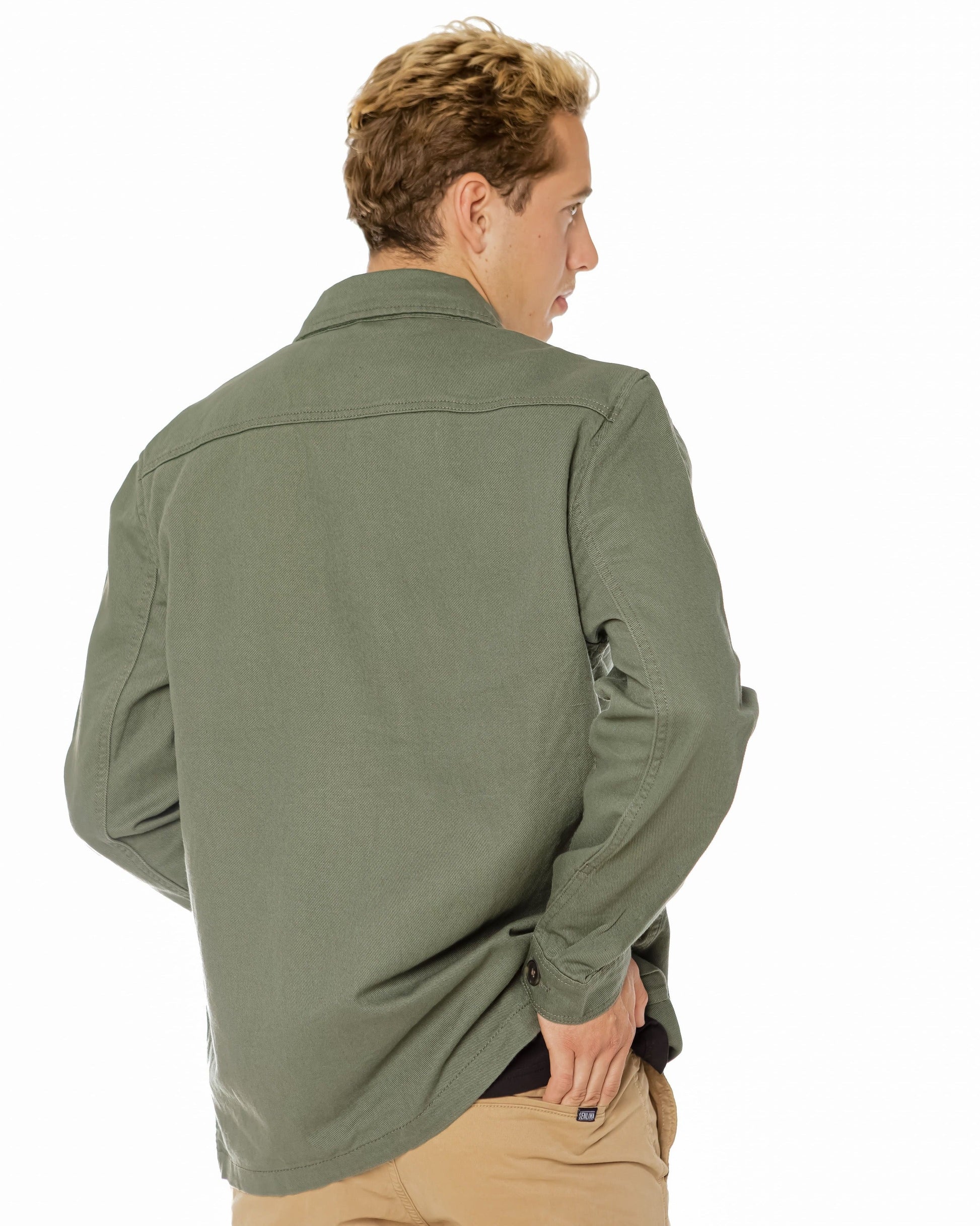Sobrecamisa de corte regular con efecto lavado, cuero reciclado, botones de plástico reciclado y botonera de puño izquierdo en rojo. Color khaki.
